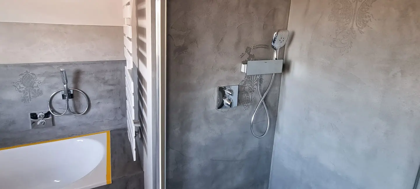Für ein modernes, individuell gestaltetes Badezimmer ohne Fliesen und Fugen bieten wir fugenlose Oberflächen. Der Nassbereich, inklusive Wände und Boden, wird mit einer zementären Spachtelmasse bearbeitet und nach Ihren Wünschen gestaltet. Farbton und Highlights können dabei frei gewählt werden, beispielsweise hinter den Armaturen. Diese Technik kann auch hinter Waschtisch oder Toilette angewendet werden, um ein stimmiges Gesamtbild zu schaffen.